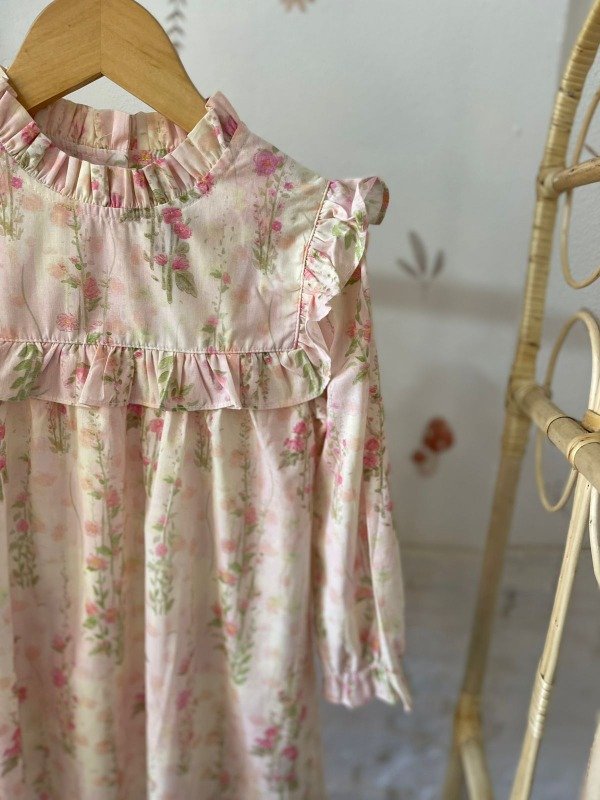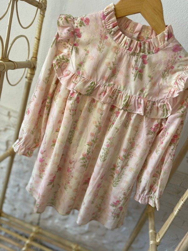 Vestido estampado de tela liviana con volados en el cuello y cuellito