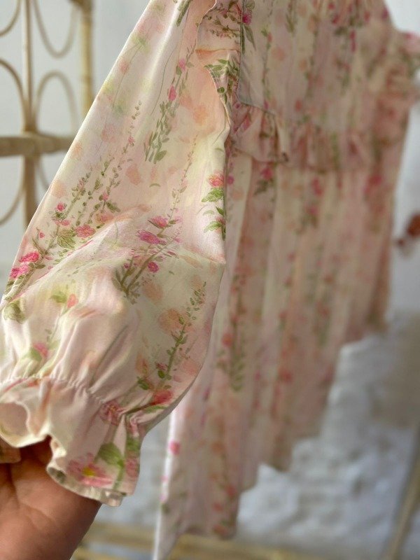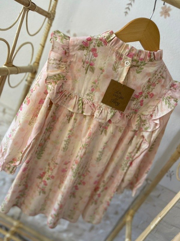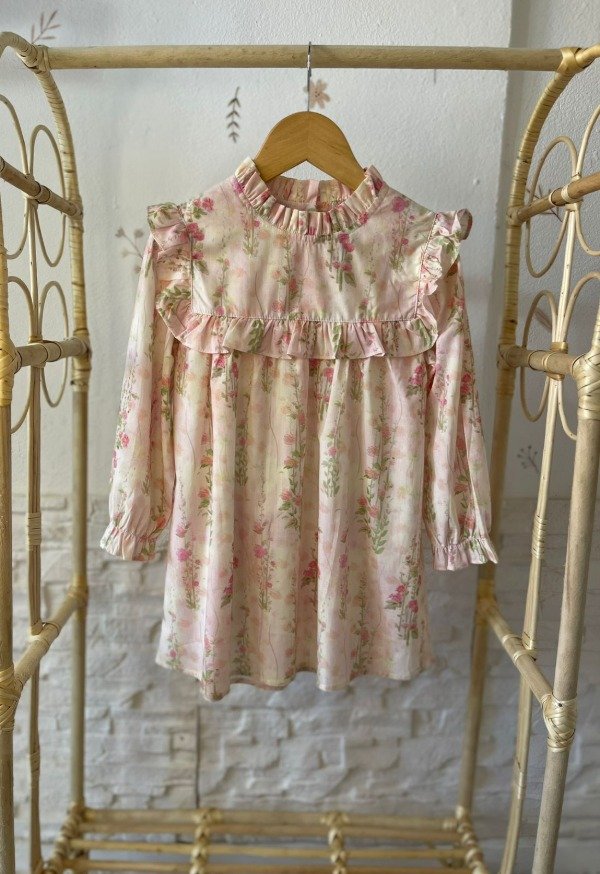 Vestido estampado de tela liviana con volados en el pecho y cuellito
