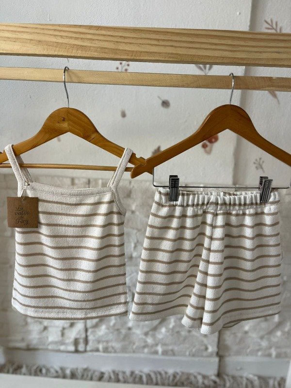 Producto compuesto por dos piezas en color beige con rallas marrones claras